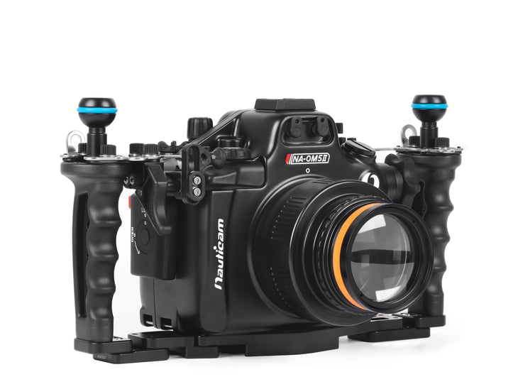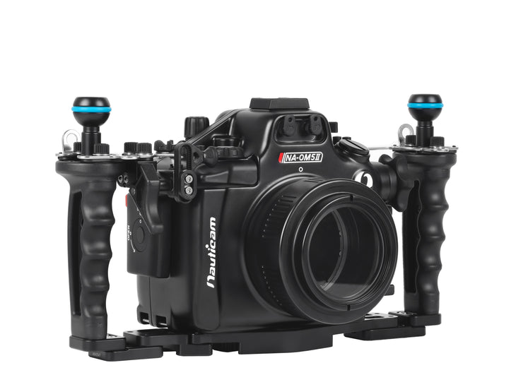 The NA-OM5II adheres to Nauticam’s Mission Control philosophy, ensuring accessible and intuitive control for critical functions. These include Front & Rear dials, REC, AF-ON, CP, Fn1 and Fn2 Lever. Nauticam’s Port locking system facilitates rapid and seamless lens changes. Battery and memory card replacements are equally effortless thanks to the rotary-style housing lock and lens release button. An optional M14 vacuum valve unlocks the full capabilities of the pre-installed Vacuum Check and Leak Detection System. The NA-OM5II LCD window, available as an optional feature, enables the utilization of Nauticam Full Frame viewfinders for enhanced viewing. For lighting and accessories, the housing incorporates an M10 treaded mounting point, a cold shoe mount, and optional handles and tray equipped with strobe mounting balls.