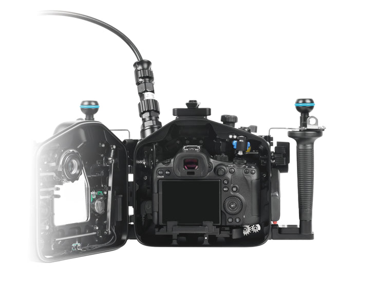 The NA-R6III underwater housing embodies Nauticam’s commitment to innovation. Essential controls are conveniently accessible without removing your hands from the ergonomic handles. The N120 port lock II, Rotary housing lock, and Dedicated RF mount Lens REL lever facilitate an efficient setup that optimizes time spent in the water and minimizes time dedicated to rig maintenance. The N120 port system accommodates both Canon RF and EF mount lenses. Nauticam’s extensive range of ports and in-house corrective optics complement the NA-R6III’s capabilities. When equipped with an accessory vacuum valve, the integrated vacuum check and leak detection system provides continuous updates on the housing’s watertight integrity. A vacuum system reset switch, situated beneath the tray, eliminates the need to open the back of the housing during lens or port changes. The NA-R6III is prepared for customization to meet your specific shooting requirements, featuring optional Full Frame viewfinders for enhanced viewing, optical and electronic strobe triggering, and support for HDMI 2.0 and 1.4 monitors. The NA-R6III is capable of supporting additional mounting with 1/4-20, M10, and M5 holes on the housing’s top surface for monitors and lighting, while the bottom accepts the 25218 Tripod Mounting Ball set.